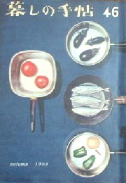 暮しの手帖第一期46号。キッチンにある道具−片手なべ・フライパン・トマト・なす・・・−で構成された素敵な表紙。画像ではちょっと分かりにくいですが、背景の紺色には細かい横線が入っていて、それもモダンな雰囲気。 アメリカの雑誌からとった「男の子の服」、26才のビジネスガールの小づかいとその使い道を公開した「ビジネスガールの小づかい」、旅行についてのあれこれを載せた「旅行」、「四日市・おもいでの街」丹羽文雄などなど。タテ25.5・ヨコ18センチ。236p。表紙・花森安治、挿画・花森安治。 | ||