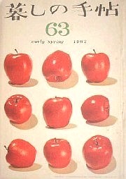 暮しの手帖第一期63号。ころんころんと並んだ真っ赤なリンゴがかわいらしい。 「奇妙な流行−アンプルに入ったのみぐすり」(花森安治)、「失礼ですが−あなたのブローチは胸の上で失業しているみたいです」(長い題ですが、ようするに正しいブローチのつけ方)、「正しいオモチャのえらび方」(年齢別のオモチャ指南)、「新築アパ6帖台付ガ水駅近」(←のようなアパートの台所を中心に改造しよう!)、「竜王国へいったおじいさん」(藤城清治の影絵話)など。表紙;花森安治、装画;花森安治・幸田侑三。 | ||