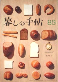 かわいらしいパンの表紙の暮しの手帖85号。「旅に明け歌に暮れて」(石井好子さんのパリ時代を綴ったエッセイ)、「ほそながいアルミの話」(アルミの角材を使って本棚・部屋の仕切りなどなどを作ろう、のススメ)、「白い服はキャンバス アクセサリは絵具」(白い服のススメ)、「つめたいココア」(作り方)、「ハンカチで作るお人形の服」(作り方・かわいらしい)などなど。表紙;花森安治、装画 ; 花森安治。