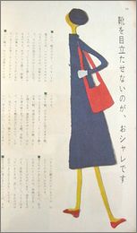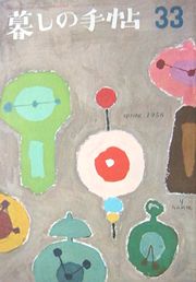 『暮しの手帖』第一期33号。表紙のうす茶色の背景に浮かぶまんまるいのは、花森さん風にディフォルメされた時計。絵の具を使って書いてあります。 内容は、「服飾の絵本」と題する色鮮やかな「靴のいろ服のいろ」(布で作られたワンピースの女の子が可愛い)、「ぬいとりのある春の服・暮しのなかのスタイルブック」など。「ずいひつ」も豪華で志賀直哉氏の「熱海と東京」が掲載されています。表紙・装画・花森安治。写真・松本政利。 | ||