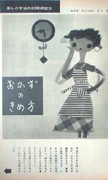 | 暮しの手帖第一期38号。淡い水彩絵具で描かれた表紙の本号も、井伏鱒二、室生犀星、志賀直哉、佐藤晴夫など、初期・暮しの手帖ならではの豪華執筆陣による随筆が掲載されています。また、「靴下でつくる人形の着もの」(作り方)、「むしやきりんご」(作り方)、「暮しの手帖料理教室A」(イラスト・色彩ともにとってもかわいい!)、「王さまになった粉ひきのハンス」(富本一枝・藤城清治の影絵話)などなども有。表紙;花森安治、装画;花森安治。 | ||