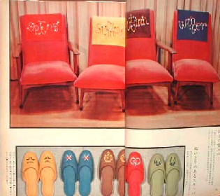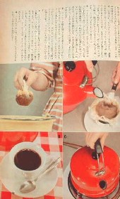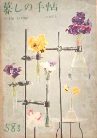 暮しの手帖第一世紀58号。表紙は、理科の実験で使うようなフラスコにパンジーの花をさした写真。題字は細い緑色。 「部屋の中の楽しみ」(手づくりのハイカラなのれん、フットラグ、マガジンラック、椅子の背カバー等々。可愛いです。)、「コーヒーの入れ方」、「袖なし上着」(袖のない上着のススメ)、「レコードプレアー」(作り方!)、「西部劇とショパンと豆と」(石井好子)、「寝室」(寝室のレイアウトなど全て)、「魔法のまんじゅう」(藤城清治の影絵話)など。表紙・花森安治、挿画・花森安治・幸田侑三。 | ||
