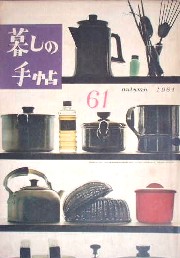 暮しの手帖第一期61号。キッチン用品のシルエットの浮かび上がったすてきな表紙。 「ちいさなおしゃれ」(グッドハウスキーピング誌からの子ども服。花森さんが描く子どものカラーイラストが可愛いです)、「家庭用消火器をテストする」(商品テスト)、「ビニールペンキの上手な使い方」、「半ダースとふたりのための家」(ペアレンツ誌からお家紹介)、「とまとはむぽてと」(石井好子さんのお料理随筆)、「ずるいうさぎ」(藤城清治の影絵話)など。表紙;花森安治、装画;花森安治・幸田侑三。 | ||