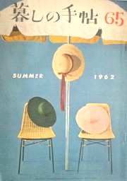暮しの手帖第一期65号。夏らしいパラソルと麦藁帽子の表紙です。「夏の食卓に−さわやかなサラダを」(作り方)、「コーヒープディング」(作り方)、「動く箱」(のんびりと大きくて、ただ四角いだけの箱、の作り方)、「印度の袋」(インド風のショルダーバック。かわいらしい!!)、「妖精のお城」(藤城清治の影絵話)など。表紙;花森安治、装画;花森安治・幸田侑三。