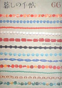 | 暮しの手帖第一期66号。この号の表紙はビーズ。きらきらと輝いているビーズが、きれいなストライプを描いています。内容は、フライパンをテストした「新しいフライパンが出ています」、紅型などの「沖縄の布」を柳悦孝氏がカラーページも交えて紹介した特集、きちんと整理できて、はくと気持ちがいい「靴下のたたみ方」、「いんちきうらない」(藤城清治の影絵話)など。お料理は「牛肉のトマト煮」「ぜんまいと豚肉のいため煮」などです。表紙;花森安治、装画;花森安治・幸田侑三。236p。 | ||